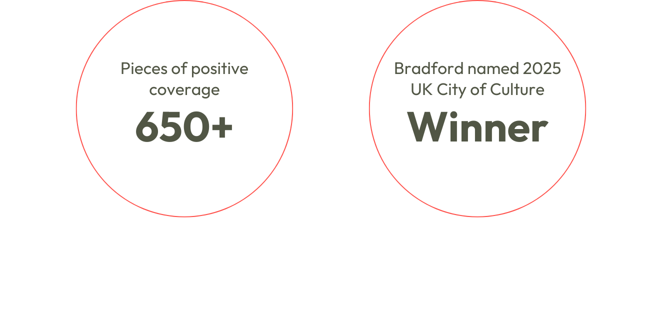 Bradford won its bid to be UK City of Culture 2025. What’s more, its narrative had already changed; we secured more than 650 pieces of positive media in one year alone. By the time Bradford’s year officially began, the coverage from The Guardian read, “Line by line, Bradford – through the City of Culture – began to take control of its own story”. Exactly as we had set out to do.